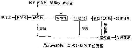 某農(nóng)藥廠生產(chǎn)樂果農(nóng)藥,生產(chǎn)過程產(chǎn)生的工業(yè)廢水先經(jīng)均質(zhì)均量調(diào)節(jié)后,進入堿解預處理池。堿解池出水經(jīng)配水稀釋使COD約為3,000mg/L,再進入序批式生物反應(yīng)器(SBR),SBR出水排入絮凝沉淀池,沉降后的上清液(COD<250mg/L)可直接排放。廢渣和污泥經(jīng)焚燒處理,排除二次污染。廢水處理工藝流程如圖所示: