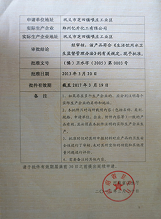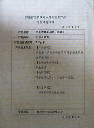 我公司自行研制、生產(chǎn)的聚合氯化鋁鐵(復(fù)合鋁鐵PAFC),其企業(yè)標(biāo)準(zhǔn)已通過河南省技術(shù)監(jiān)督部門批準(zhǔn)。產(chǎn)品經(jīng)河南省衛(wèi)生廳檢驗,完全符合《生活飲用水衛(wèi)生監(jiān)督管理辦法》的規(guī)定,并頒發(fā)有《涉及飲用水衛(wèi)生安全的國內(nèi)產(chǎn)品衛(wèi)生許可批件》。